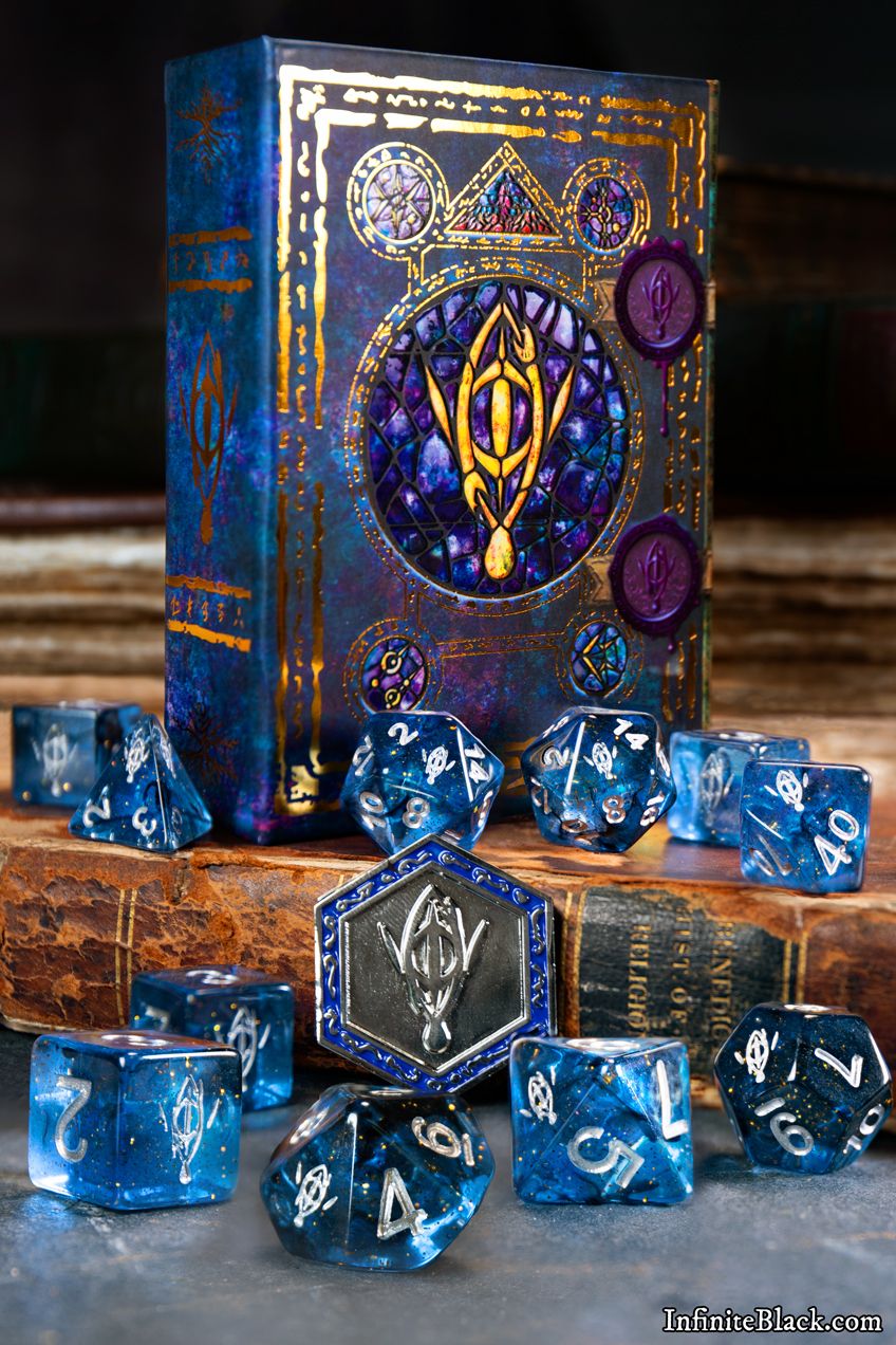 "Interstellar" includes a spell book with a magnetic clasp and 11 standard size polyhedral dice with the Crown of the Night Mother.
