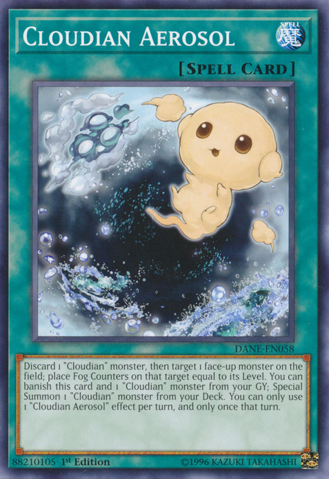 Discard 1 "Cloudian" monster, then target 1 face-up monster on the field; place Fog Counters on that target equal to its Level. You can banish this card and 1 "Cloudian" monster from your GY; Special Summon 1 "Cloudian" monster from your Deck. You can only use 1 "Cloudian Aerosol" effect per turn, and only once that turn.