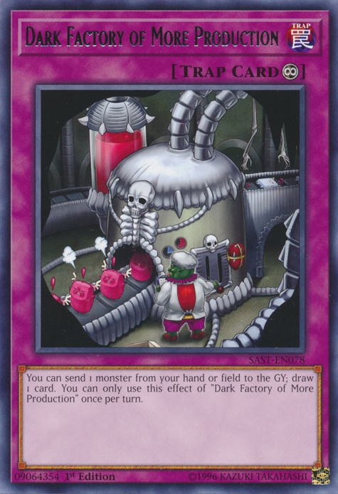 You can send 1 monster from your hand or field to the GY; draw 1 card. You can only use this effect of "Dark Factory of More Production" once per turn.