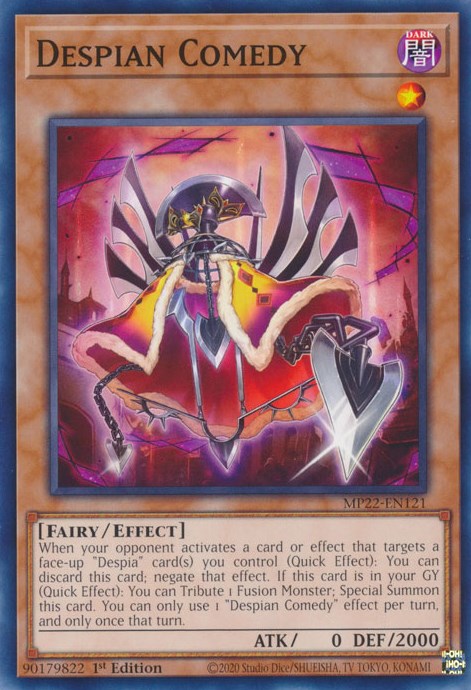 When your opponent activates a card or effect that targets a face-up "Despia" card(s) you control (Quick Effect): You can discard this card; negate that effect. If this card is in your GY (Quick Effect): You can Tribute 1 Fusion Monster; Special Summon this card. You can only use 1 "Despian Comedy" effect per turn, and only once that turn.