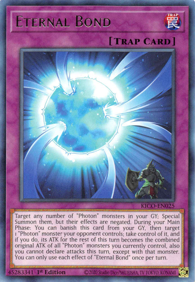 Target any number of "Photon" monsters in your GY; Special Summon them, but their effects are negated. During your Main Phase: You can banish this card from your GY, then target 1 "Photon" monster your opponent controls; take control of it, and if you do, its ATK for the rest of this turn becomes the combined original ATK of all "Photon" monsters you currently control, also you cannot declare attacks this turn, except with that monster. You can only use each effect of "Eternal Bond" once per turn.