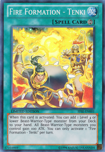 When this card is activated: You can add 1 Level 4 or lower Beast-Warrior-Type monster from your Deck to your hand. All Beast-Warrior-Type monsters you control gain 100 ATK. You can only activate 1 "Fire Formation - Tenki" per turn.