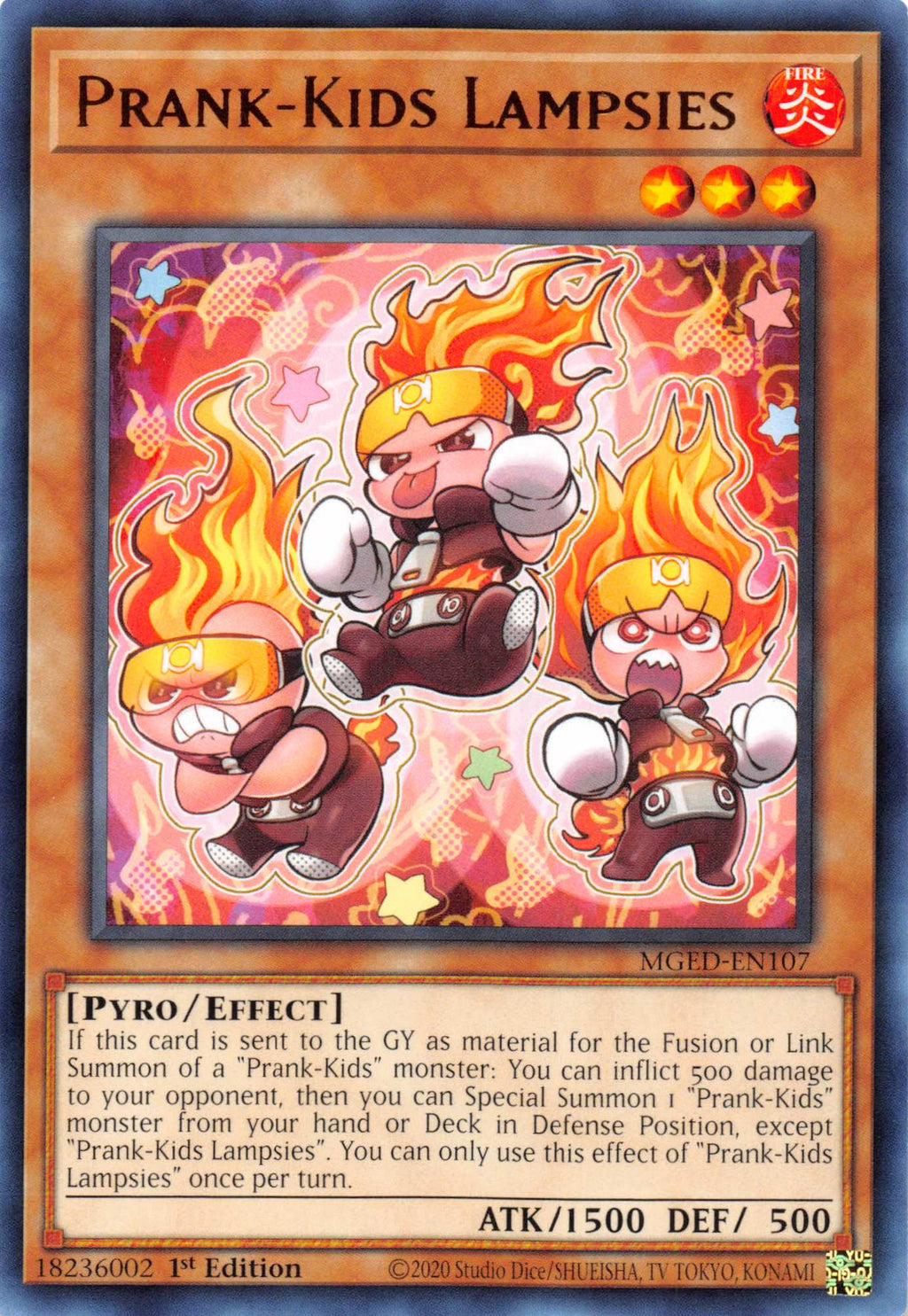If this card is sent to the GY as material for the Fusion or Link Summon of a "Prank-Kids" monster: You can inflict 500 damage to your opponent, then you can Special Summon 1 "Prank-Kids" monster from your hand or Deck in Defense Position, except "Prank-Kids Lampsies". You can only use this effect of "Prank-Kids Lampsies" once per turn.