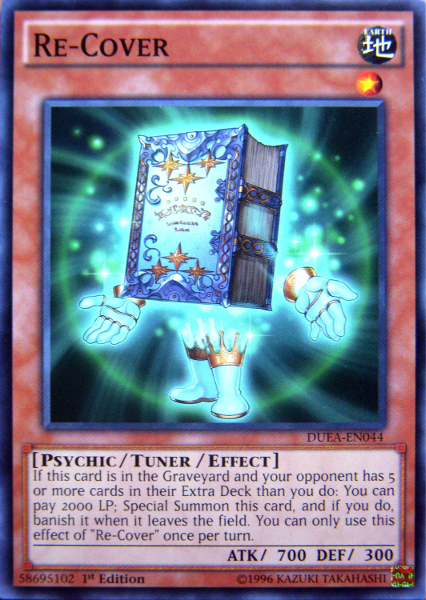 If this card is in the Graveyr and your opponet has 5 or more cards in their Extra Deck than you do: You can pay 2000 LP; Special Summon this card, and if you do, banish it when it leaves the field. You can only use this effect of "Re-Cover" once per turn.