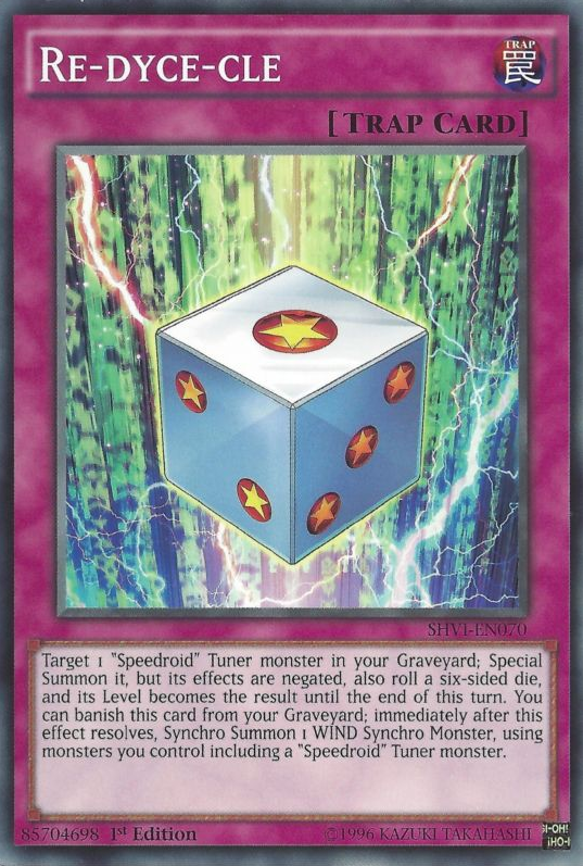 Target 1 "Speedroid" Tuner monster in your Graveyard; Special Summon it, but its effects are negated, also roll a six-sided die, and its Level becomes the result until the end of this turn. You can banish this card from your Graveyard; immediately after this effect resolves, Synchro Summon 1 WIND Synchro Monster, using monsters you control including a "Speedroid" Tuner monster.