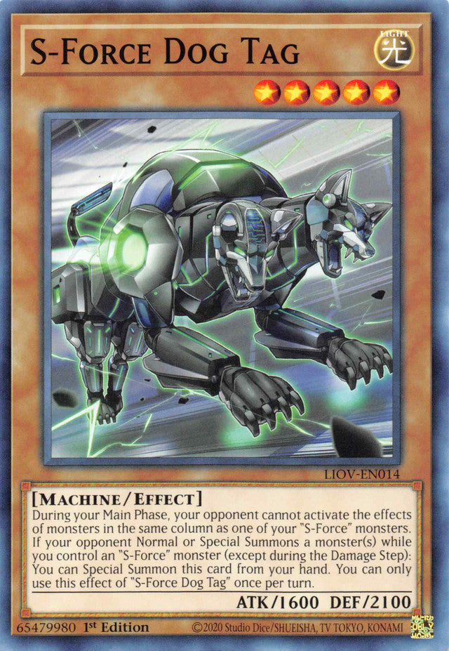 During your Main Phase, your opponent cannot activate the effects of monsters in the same column as one of your "S-Force" monsters. If your opponent Normal or Special Summons a monster(s) while you control an "S-Force" monster (except during the Damage Step): You can Special Summon this card from your hand. You can only use this effect of "S-Force Dog Tag" once per turn.