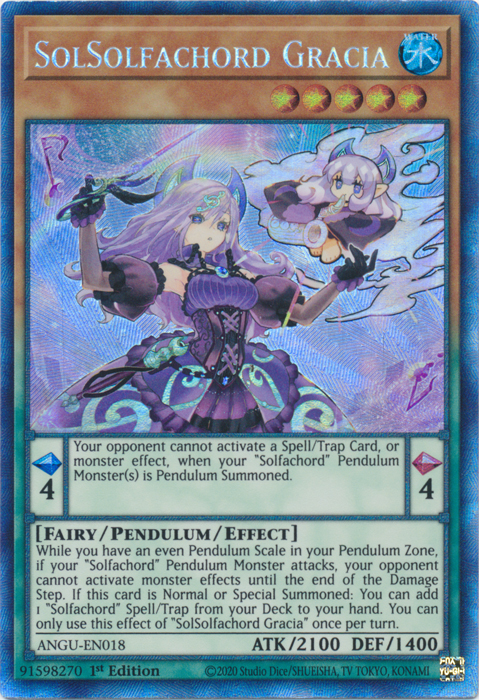 While you have an even Pendulum Scale in your Pendulum Zone, if your "Solfachord" Pendulum Monster attacks, your opponent cannot activate monster effects until the end of the Damage Step. If this card is Normal or Special Summoned: You can add 1 "Solfachord" Spell/Trap from your Deck to your hand. You can only use this effect of "SolSolfachord Gracia" once per turn.
