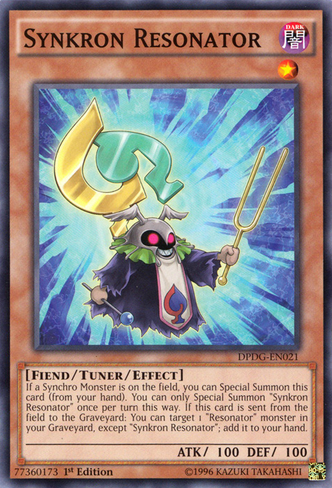 If a Synchro Monster is on the field, you can Special Summon this card (from your hand). You can only Special Summon "Synkron Resonator" once per turn this way. If this card is sent from the field to the Graveyard: You can target 1 "Resonator" monster in your Graveyard, except "Synkron Resonator"; add it to your hand.