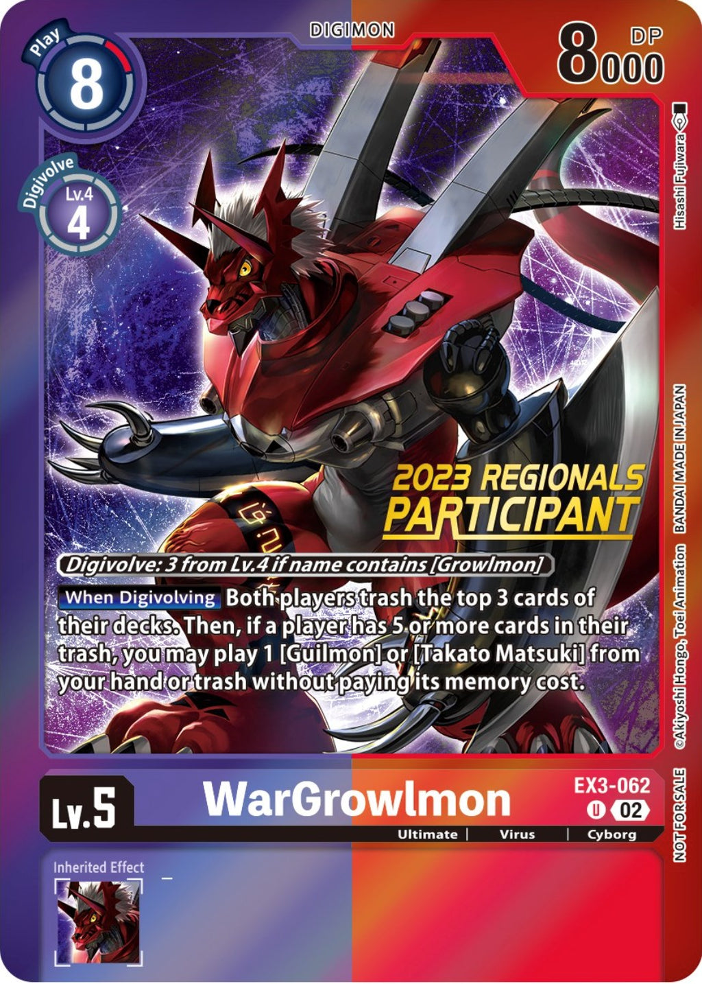 [When Digivolving] Trash the top 3 cards of both players' decks. Then, if either player has 5 or more cards in their trash, you may play 1 [Guilmon] or [Takato Matsuki] from your hand or trash without paying the cost.